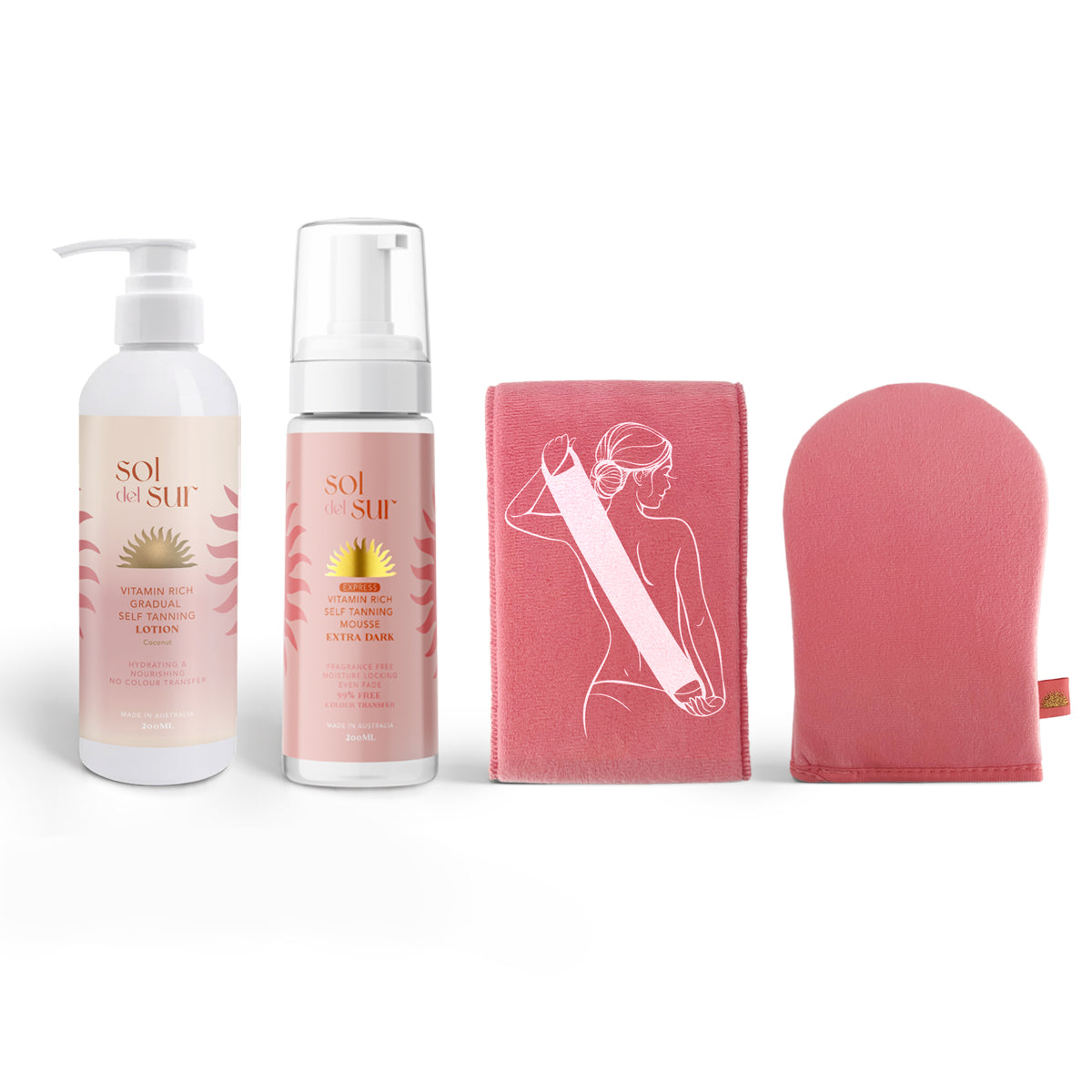 The ideal products for glowing skin all year round. With our Luxury Back Applicator included, you can effortlessly apply our 'white sheet friendly' no transfer fake tan all over by yourself!